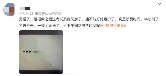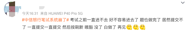 10月22日下午,大量网友在微博发文称自己在参加中信银行校招在线笔试时考试系统崩了。