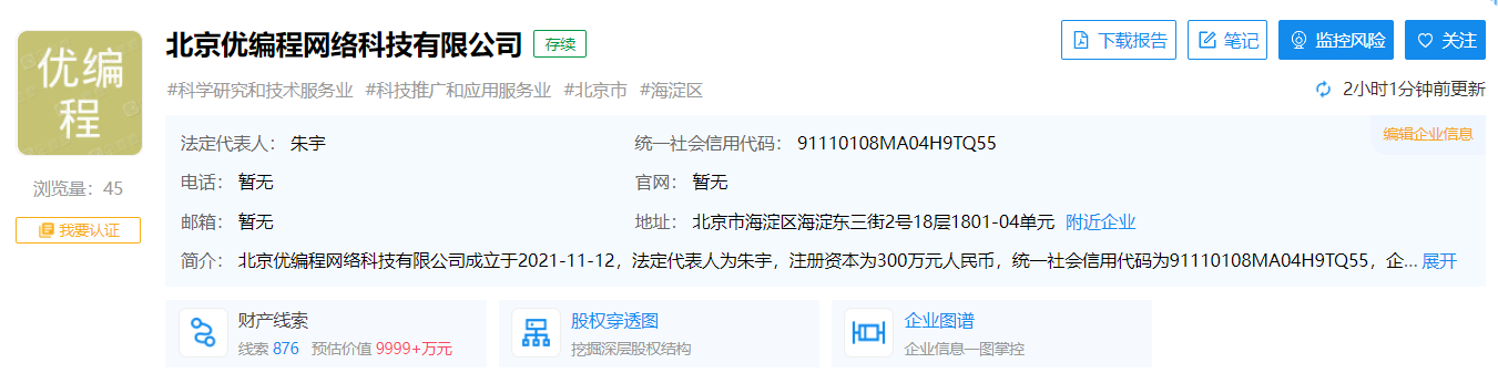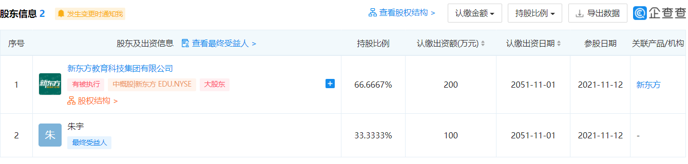 企查查App显示,近日,北京优编程网络科技有限公司成立,注册资本300万人民币,法定代表人为朱宇,经营范围包括软件开发;模型设计;教育咨询;销售文化用品、计算机、软件及辅助设备等。股东信息显示,该公司由新东方教育科技集团有限公司、朱宇分别持股约66.67%、33.33%。