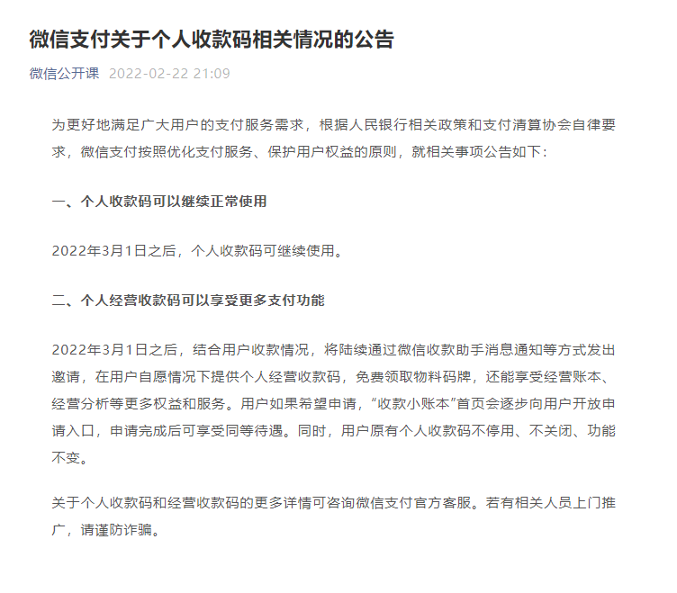 2022-02-23 15:40:46阅读()互联网2月22日消息,今天微信官方发布关于个人收款码相关情况的公告,为更好地满足广大用户的支付服务需求,根据人民银行相关政策和支付清算协会自律要求,微信支付按照优化支付服务、保护用户权益的原则,就相关事项公告如下:
