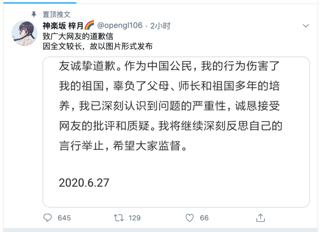 作为中国公民,我的行为伤害了我的祖国,辜负了父母、师长和祖国多年的培养,我已深刻认识到问题的严重性,诚恳接受网友的批评和质疑。我将继续深刻反思自己的言行举止,希望大家监督。