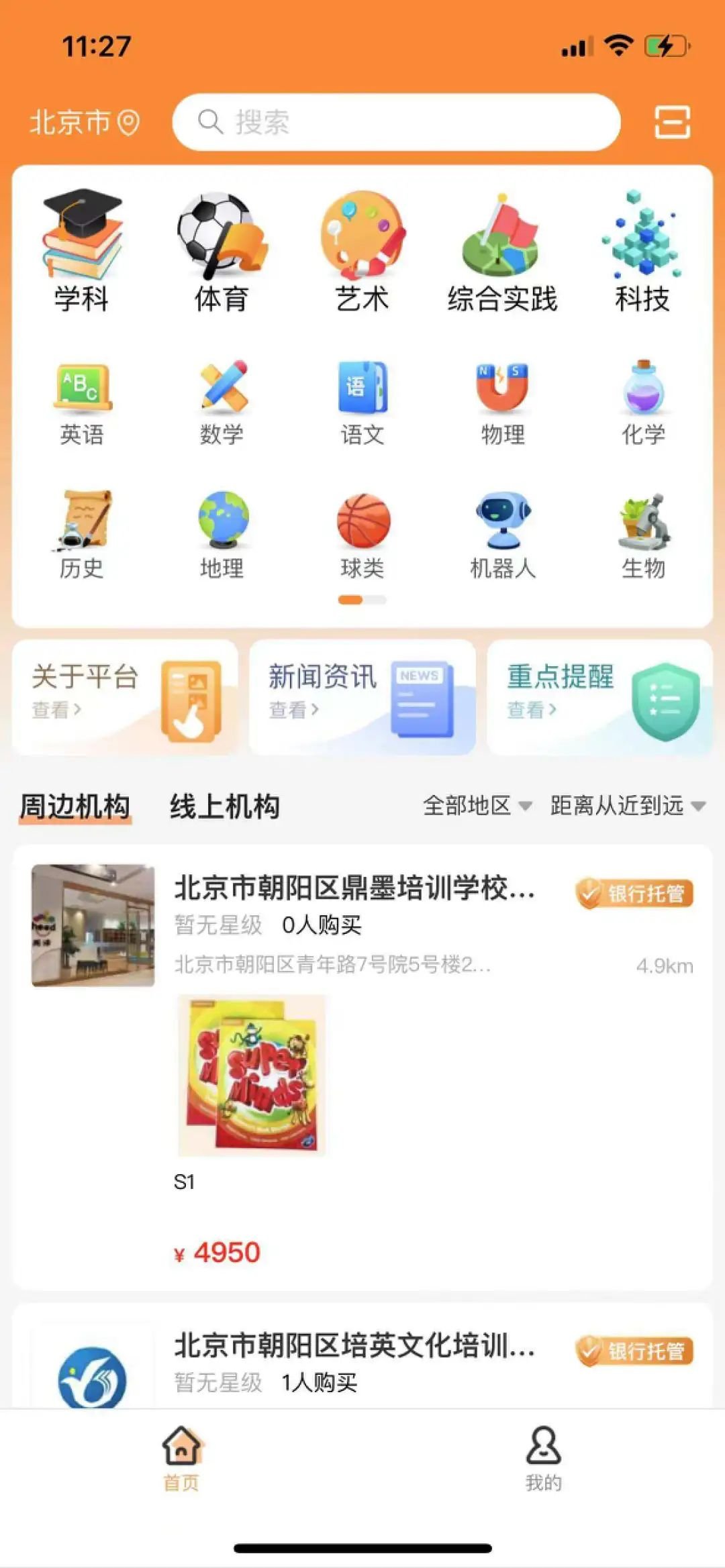 在“校外培训家长端”App首页,有学科、体育、艺术、综合实践、科技、英语、数学、语文、物理、化学、历史、地理等所有校外学科,集中了当地的线下教育培训机构。