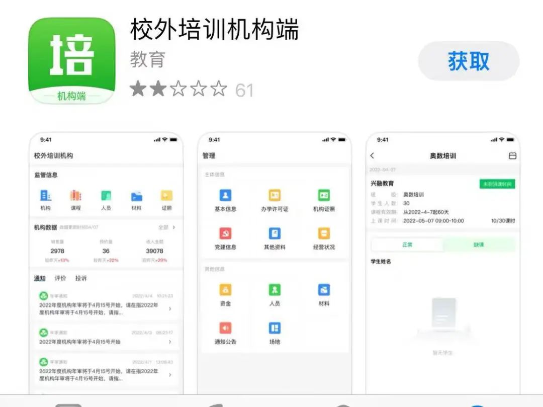 而针对线下教育培训机构,教育部旗下中央电化教育馆还推出了“校外培训机构端”App,支撑落实备案审批制度。同时,还推出了“校外培训管理端”App,形成教育培训监管与服务的App矩阵。