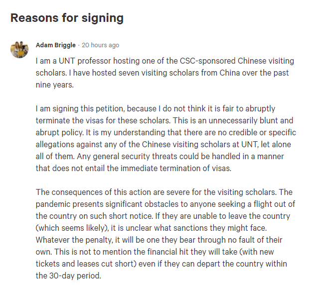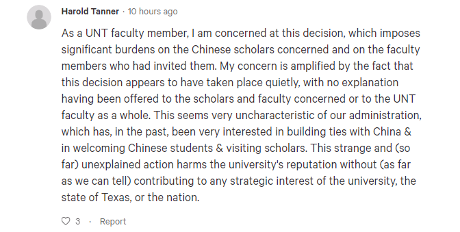 其中,一名直接参与了该校中国公派学生学者项目的教授,就在上述求助帖中留言,表示学校对这些中国留学生和学者的做法“是不公平的”,而且也是“毫无必要”的,因为他没听说过北得克萨斯州大学的任何中国公派留学生和学者中,有人遭到任何具体的指控。所以他无法理解为何学校要一下子就把所有中国公派留学生和学者全都赶走。
