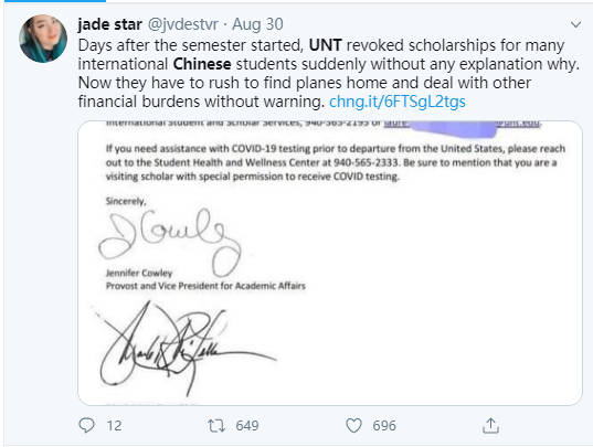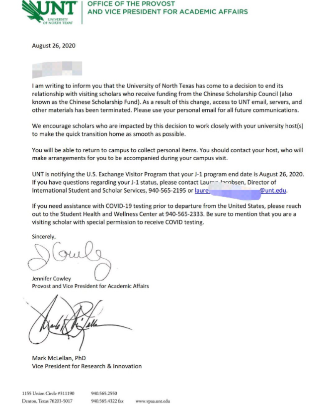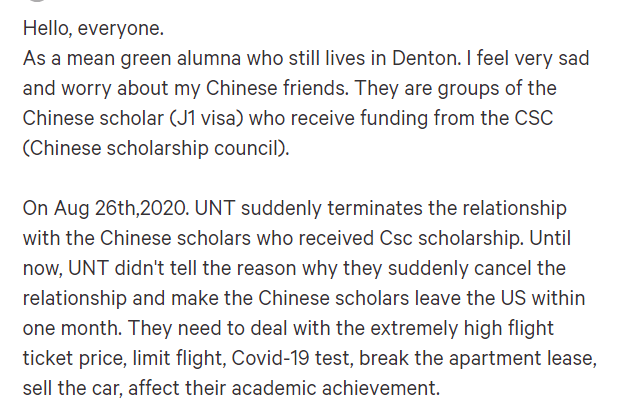 在美国请愿类信息网站“Change.org”上,一则为北得克萨斯州大学的中国留学生求助的网贴就表示,该校是在8月26日当天突然宣布中止受中国国家留学基金委员会资助的访问学生和学者的学习资格的,并要求这些持有J-1类签证的中国公派留学生和学者在1个月内离境。可该校至今也没有透露这么做的原因是什么。