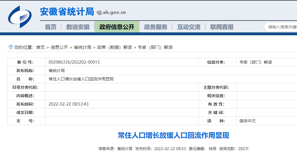 安徽省统计局:安徽省常住人口最新数据公布,增加10万人