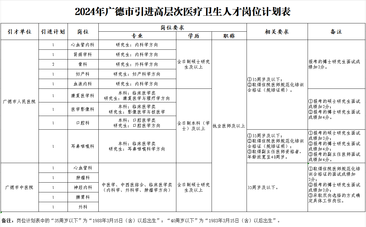 具体要求详见附件1(《2024年广德市引进高层次医疗卫生人才岗位计划表》)。
