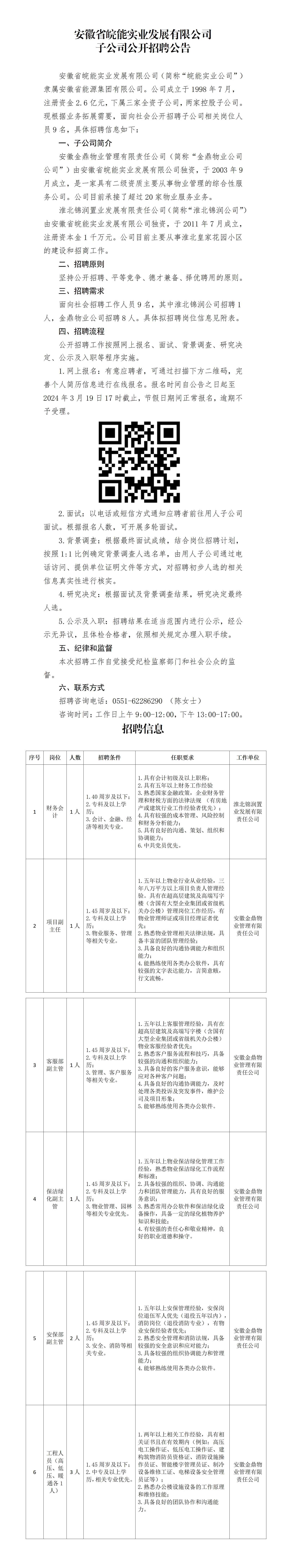 2024-03-13 11:51:00阅读()安徽省能源集团有限公司安徽省皖能实业发展有限公司(简称“皖能实业公司”)隶属安徽省能源集团有限公司。公司成立于1998年7月,注册资金2.6 亿元,下属三家全资子公司,两家控股子公司。现根据业务拓展需要,面向社会公开招聘子公司相关岗位人员9名,具体招聘信息如下: