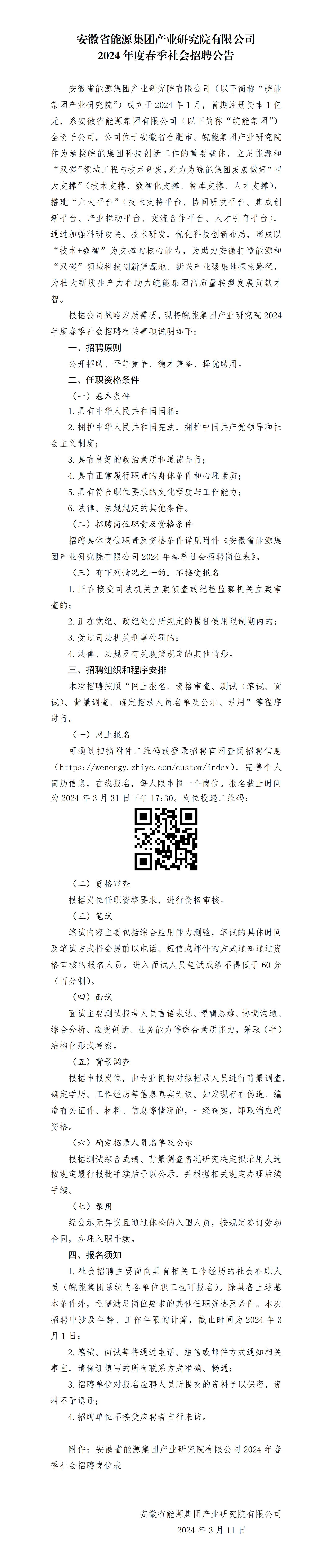 2024年安徽省能源集团产业研究院有限公司春季社会招聘公告