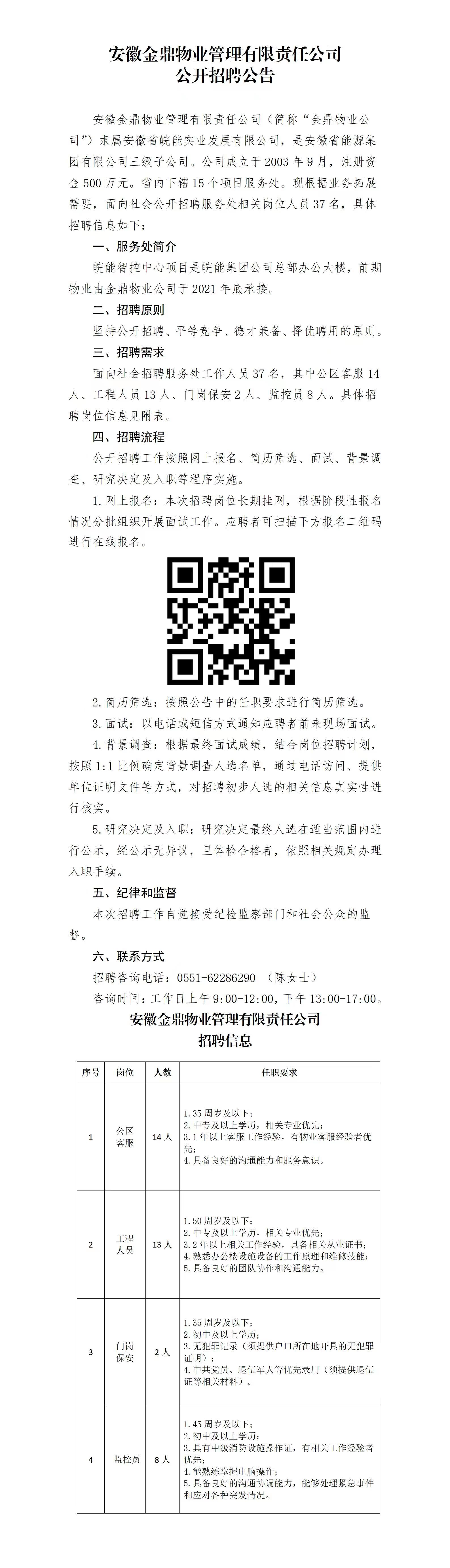 2024-04-17 10:34:52阅读()安徽省能源集团有限公司安徽金鼎物业管理有限责任公司(简称“金鼎物业公司”)隶属安徽省皖能实业发展有限公司,是安徽省能源集团有限公司三级子公司。公司成立于2003年9月,注册资金500万元。省内下辖15个项目服务处。现根据业务拓展需要,面向社会公开招聘服务处相关岗位人员37名,具体招聘信息如下: