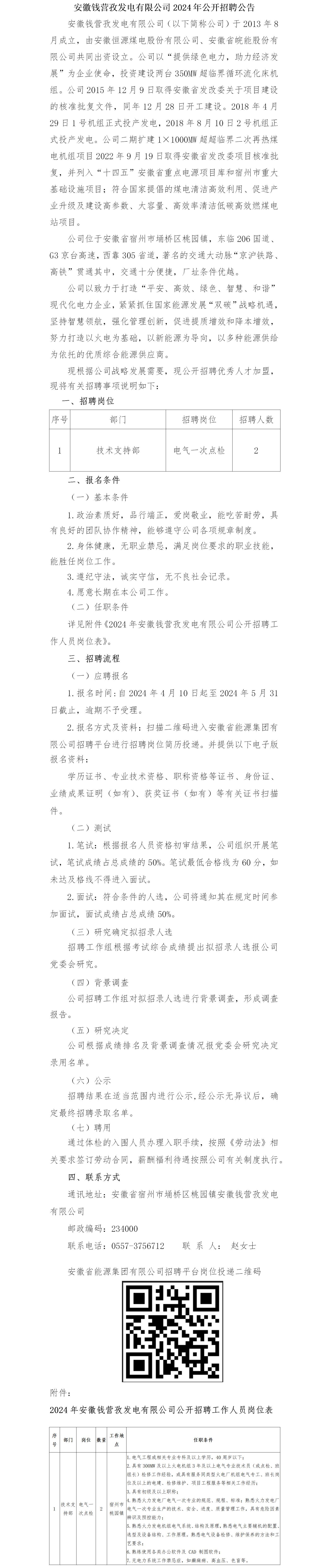 2024年宿州安徽钱营孜发电有限公司公开招聘公告