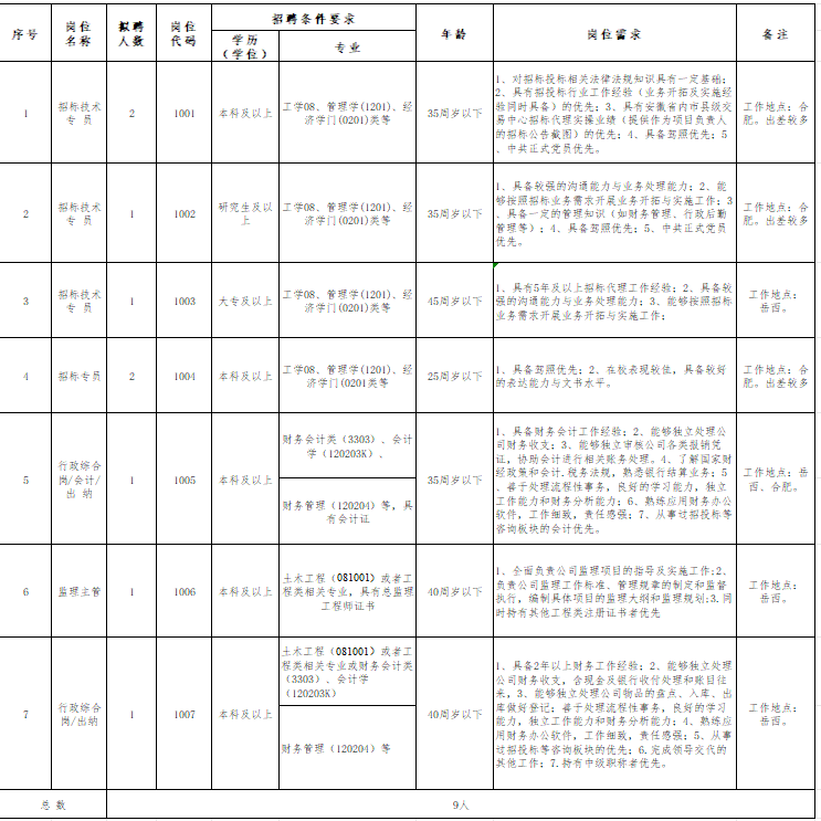 1.岗位需求:招聘人数共计9人,具体招聘岗位详见附件1:《安徽皖岳信合项目管理有限公司2024年公开招聘岗位需求表》。