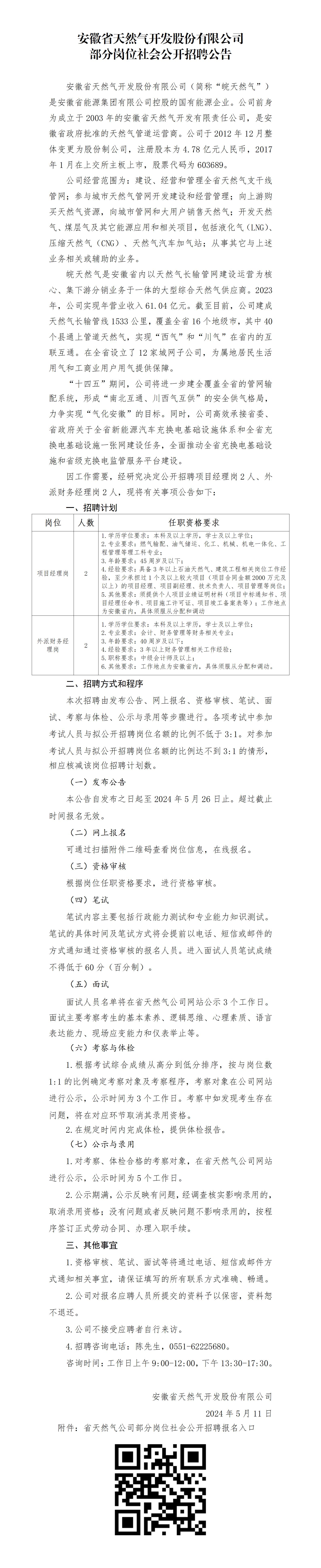 2024年安徽省天然气开发股份有限公司部分岗位社会公开招聘公告