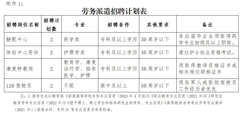 具体招聘岗位及人数详见附件1:劳务派遣招聘计划表