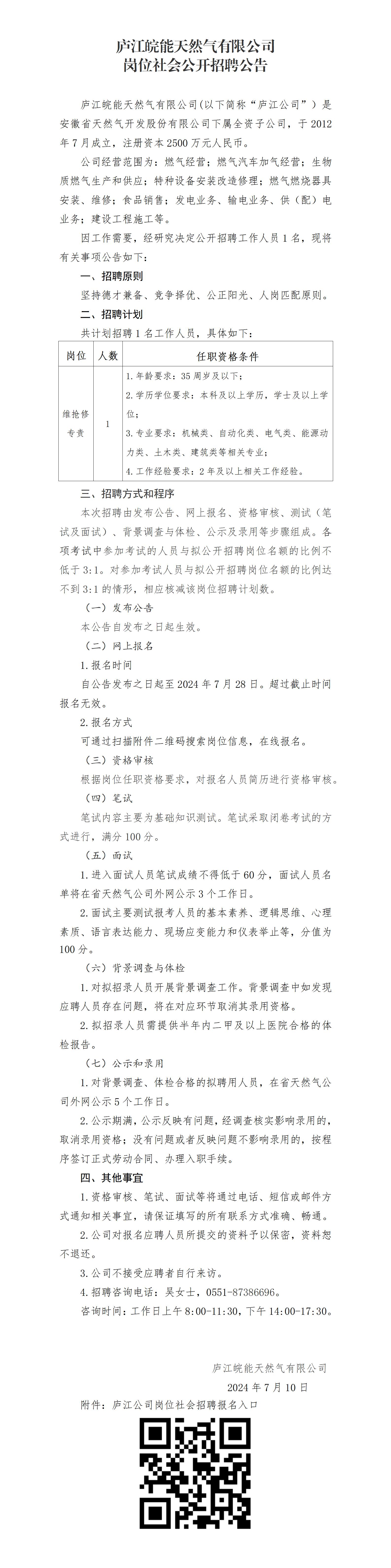 / 2024年合肥庐江皖能天然气有限公司岗位社会公开招聘公告