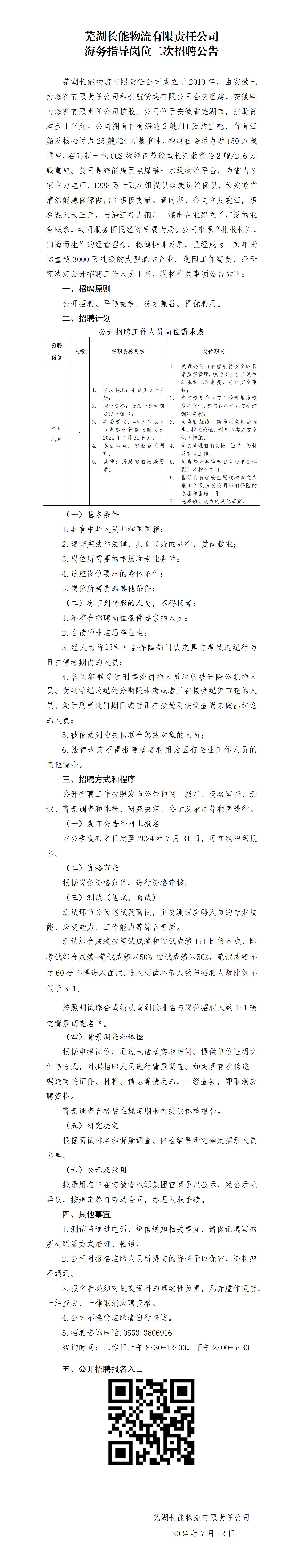 / 2024年芜湖长能物流有限责任公司海务指导岗位二次招聘公告