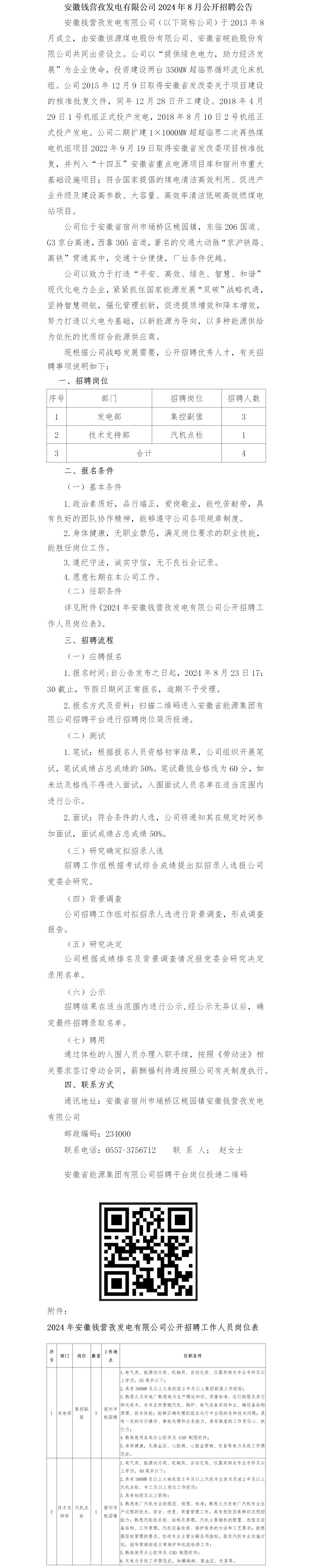 2024年宿州安徽钱营孜发电有限公司开招聘公告