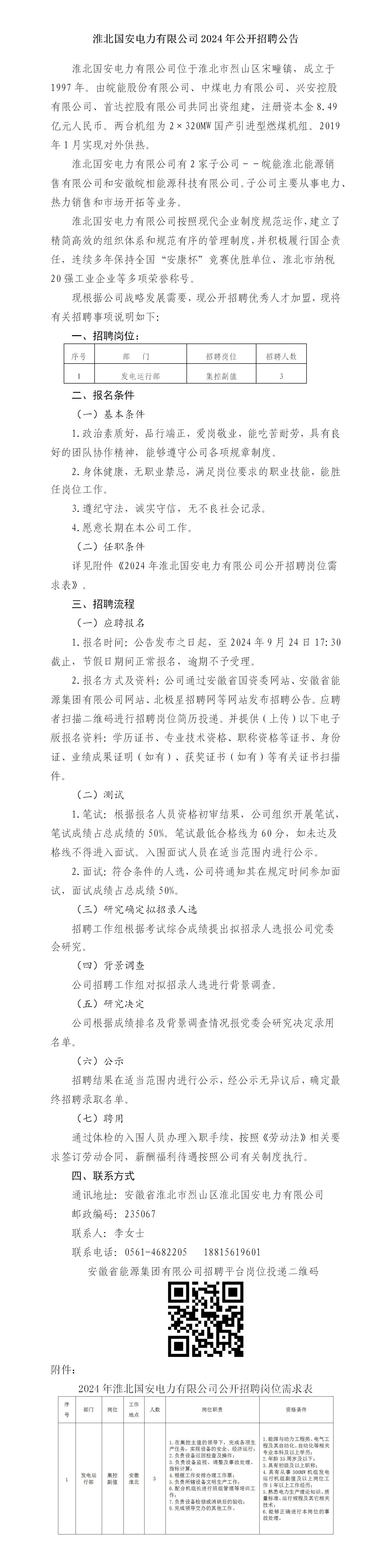 2024-09-11 15:19:46阅读()安徽省能源集团有限公司淮北国安电力有限公司位于淮北市烈山区宋疃镇,成立于1997年。由皖能股份有限公司、中煤电力有限公司、兴安控股有限公司、首达控股有限公司共同出资组建,注册资本金8.49亿元人民币。两台机组为2× 32OMW国产引进型燃煤机组。2019年1月实现对外供热。