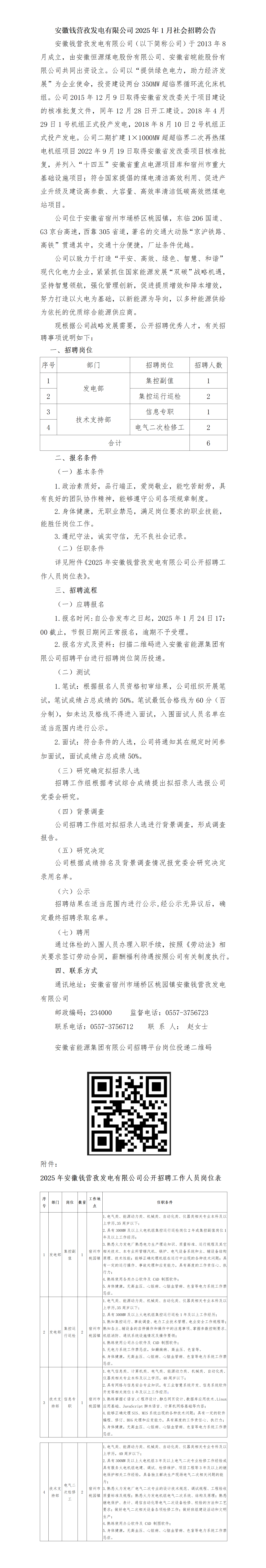 / 2025年安徽钱营孜发电有限公司1月社会招聘公告