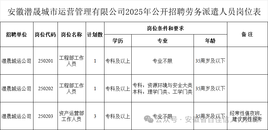 根据工作需要,安徽潜晟城市运营管理有限公司委托安徽省百佳信人力资源服务有限责任公司面向社会公开招聘劳务派遣人员5名,聘用人员将通过劳务派遣方式在安徽潜晟城市运营管理有限公司工作,现就招聘工作有关事项公告如下: