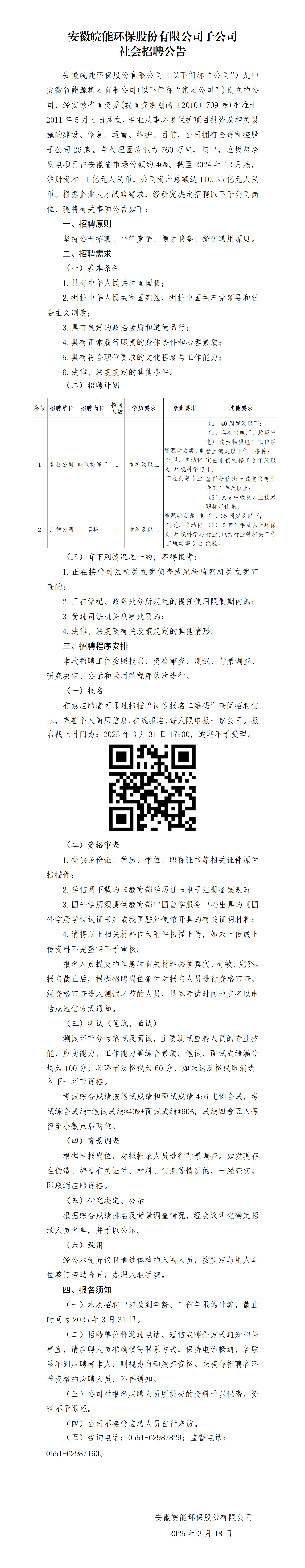/ 2025年安徽皖能环保股份有限公司子公司社会招聘公告
