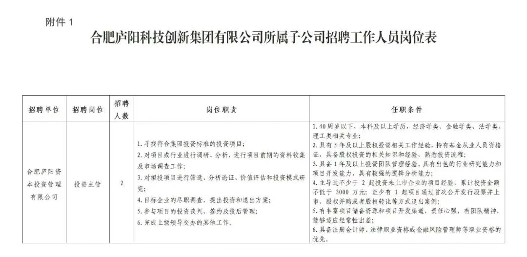 因工作需要,现面向社会公开招聘子公司合肥庐阳资本投资管理有限公司工作人员6名,有关事项具体如下: