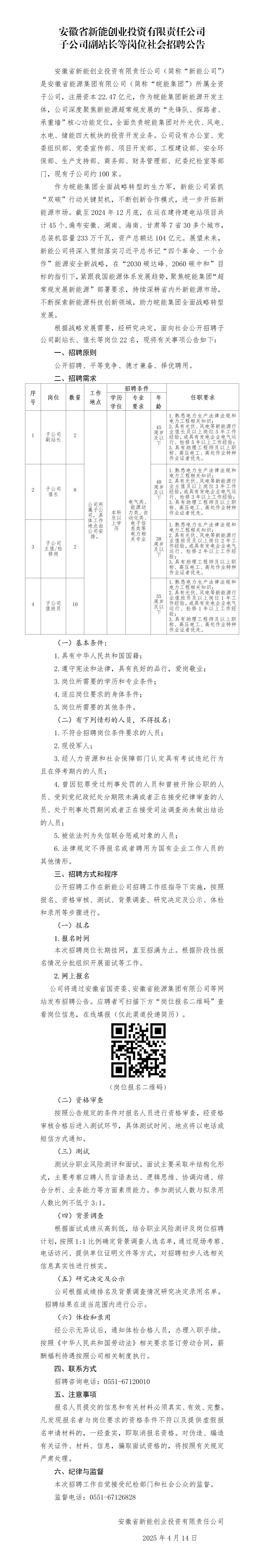 2025年安徽省新能创业投资有限责任公司子公司副站长等岗位社会招聘公告
