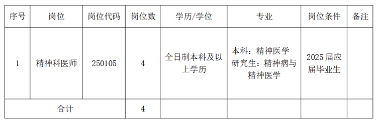 2025年度校园招聘卫生专业技术人员4名,具体岗位信息详见下表: