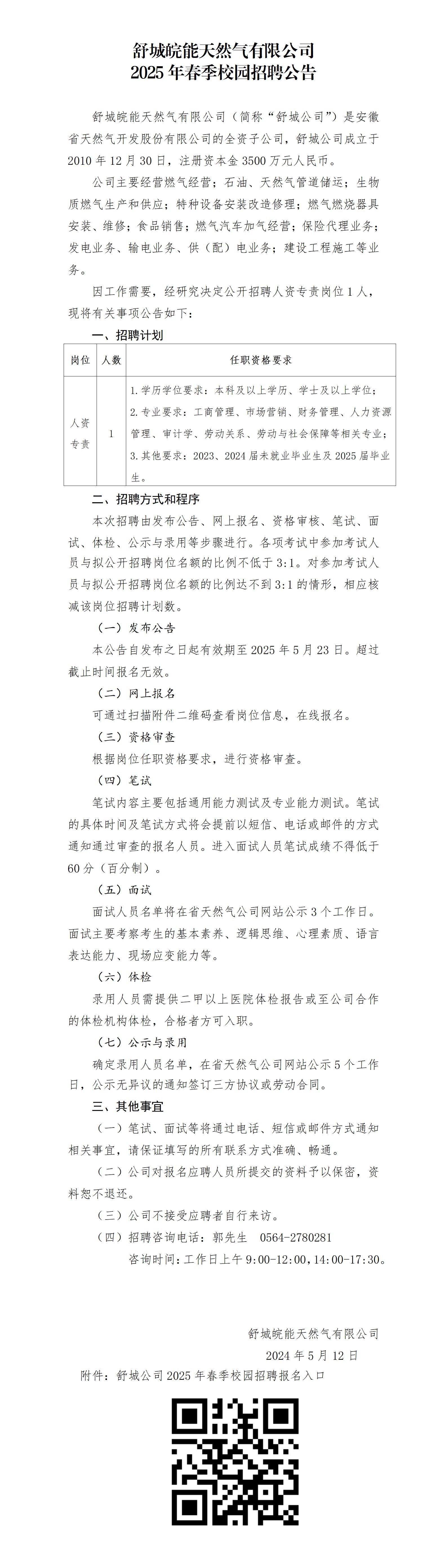 2025年六安舒城皖能天然气有限公司春季校园招聘公告