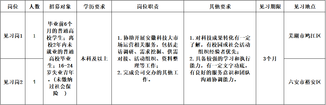 因工作需要,经安徽科技大市场建设运营有限责任公司研究决定,委托安徽皖信人力资源管理有限公司公开招募2名见习人员。现就有关事项公告如下: