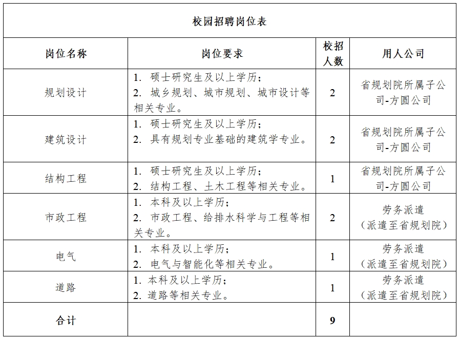 2.应聘条件:详见附件《安徽省城乡规划设计研究院有限公司及所属方圆公司2025年度第一次社会、校园公开招聘岗位表》。