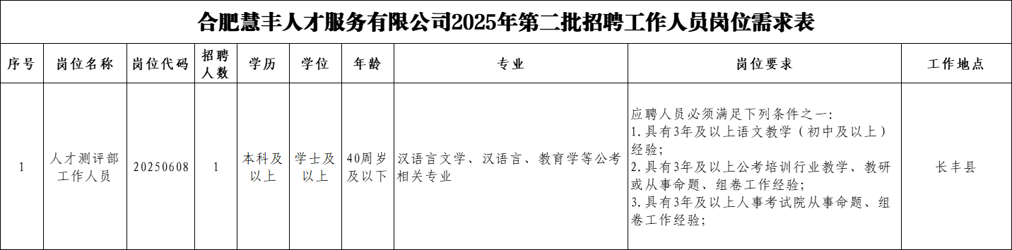 (一)招聘岗位详见《合肥慧丰人才服务有限公司2025年第二批招聘工作人员岗位需求表》