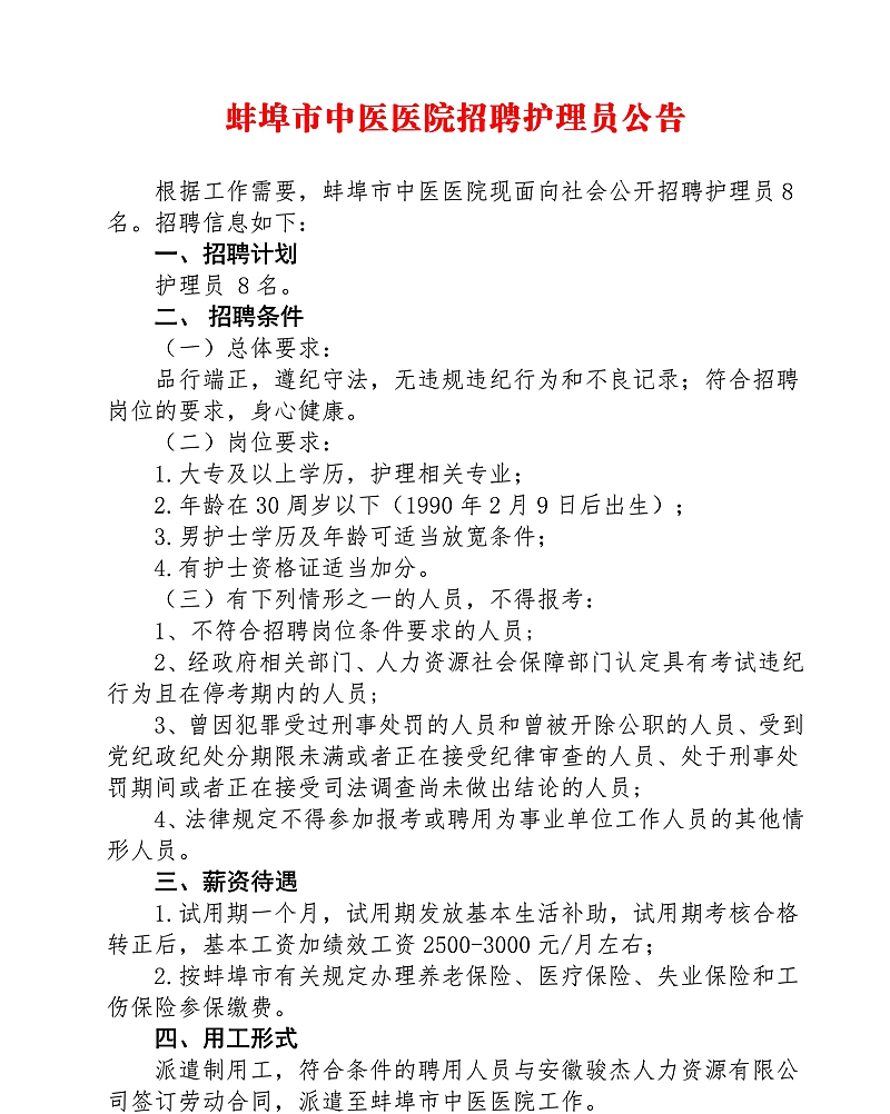 / 2020年蚌埠市中医医院招聘护理员公告