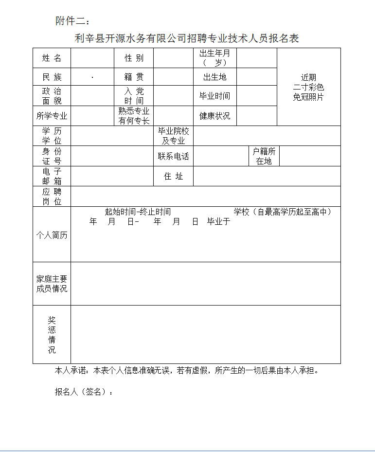 (1)《利辛县开源水务有限公司招聘专业技术人员报名表》1份(见附件二);