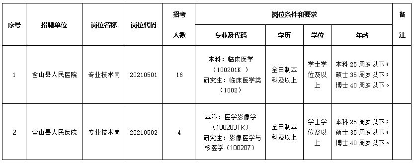 (二)岗位基本条件。报考人员需具备岗位所需的专业或技能条件以及适应岗位要求的身体条件。职位具体条件详见《含山县县级公立医院2021年皖南医学院专场招聘卫生专业技术人员岗位计划表》。2021年应届毕业生必须在2021年7月31日前取得相应的毕业证书和学位证书。