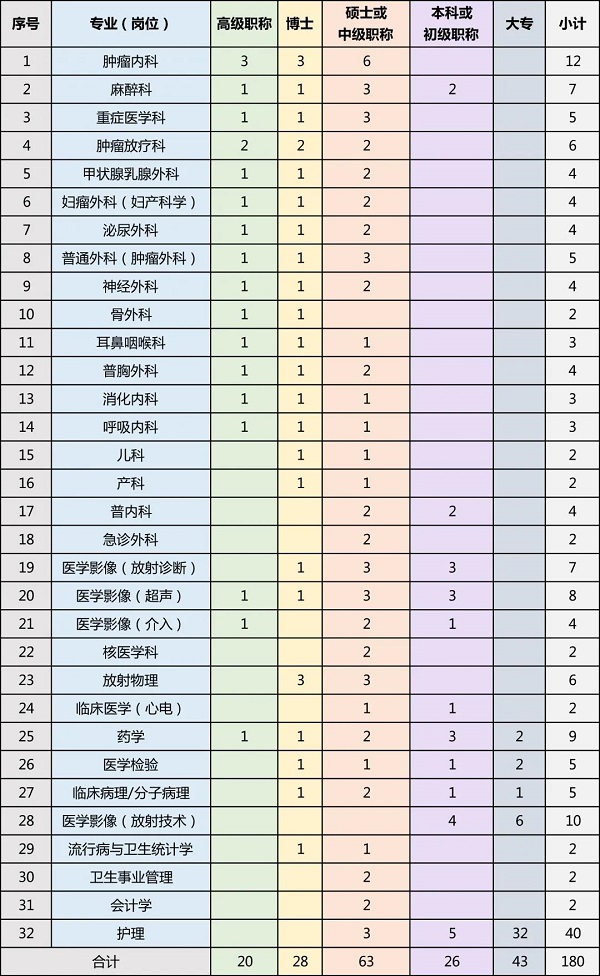 在中科院和安徽省暨合肥市的大力支持下,一所1500张床位的高水平、现代化三级甲等肿瘤专科医院(高新院区)正在建设中,根据医院发展规划,现面向全社会公开招聘各类专业技术人才,2020年人才招聘计划如下: