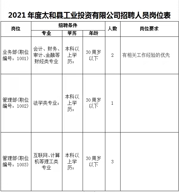 太和县工业投资有限公司是经太和县人民政府批准,由太和县国有资产管理局单独出资设立的一家国有独资公司。公司主营工业项目投资、助保金贷款、资产运营、工业项目信息咨询服务、基础设施建设、棚户区改造、农村路网建设、农业技术开发、污水处理等。现根据公司业务发展需要,拟面向社会公开招聘6名工作人员,具体公告如下: