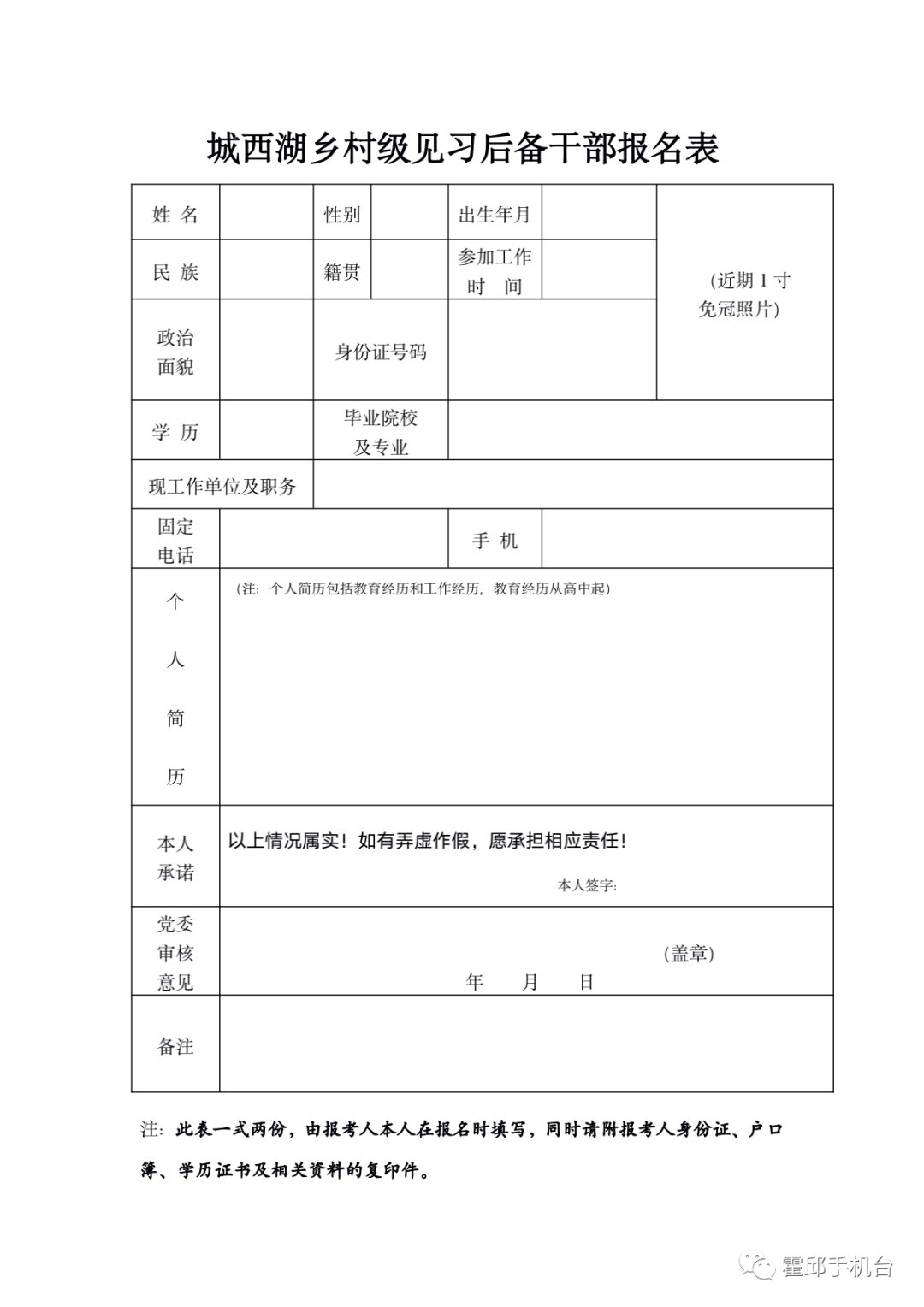 报名方式:符合条件的报名人员需携带有效居民身份证、户口薄、学历毕业证书、党员证明材料、退役军人证明原件以及复印件各1份、1寸证件照4张到乡党建办报名,填写《城西湖乡公开选聘见习村干部报名表》报名。