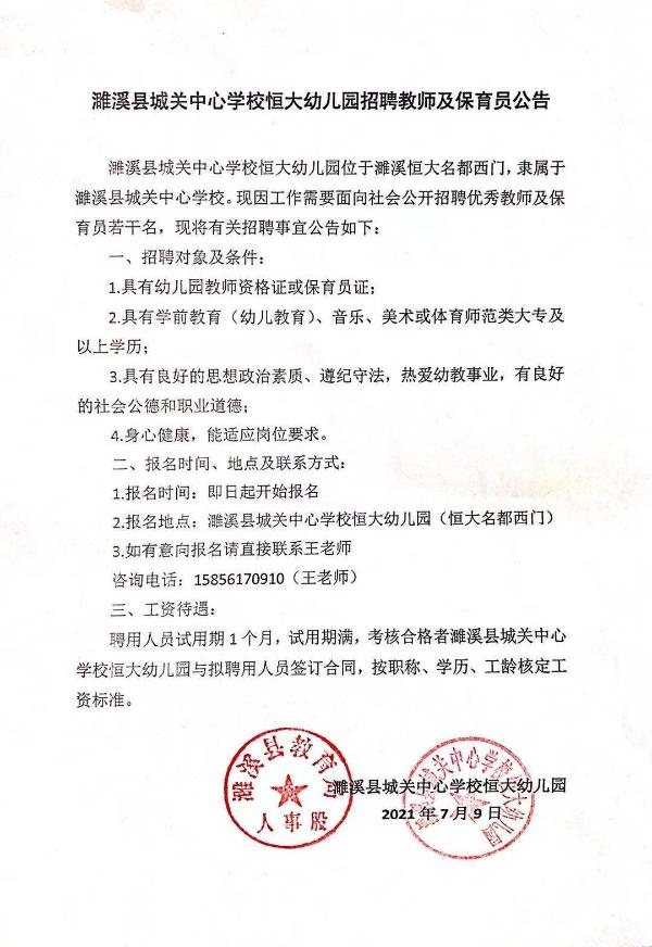 2021-07-09 14:32:40阅读()淮北市教育局滩溪县城关中心学校恒大幼儿园位于裤溪恒大名都西门,隶属于滩溪县城关中心学校。现因工作需要面向社会公开招聘优秀教师及保育员若干名,现将有关招聘事宜公告如下: