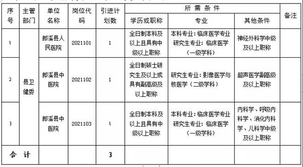 全县县级公立医院共计划引进高层次、急需紧缺医疗技术人才3名,具体岗位、专业等要求如下: