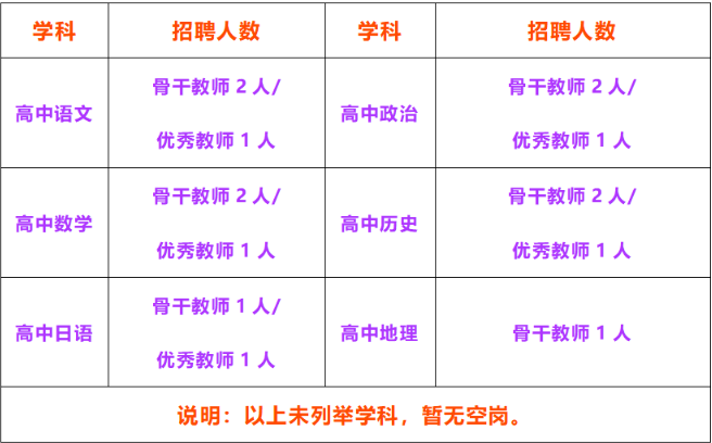 以上所有岗位均须大学本科及以上学历,持有高中教师资格证且专业对口(研究生学历者至少要求本科阶段专业对口)。