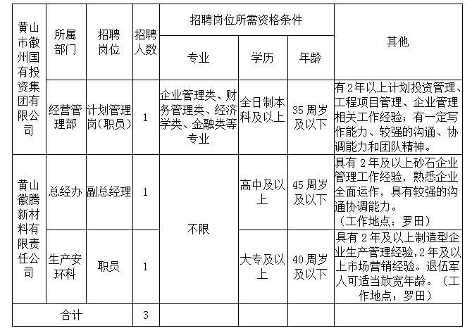 2021-09-14 20:46:58阅读()黄山市徽州国有投资集团有限公司徽州国投集团及下属子公司因工作需要,面向社会公开招聘3名工作人员,其中集团本部工作人员1名、徽腾新材料公司2名。现将有关招聘事宜公告如下: