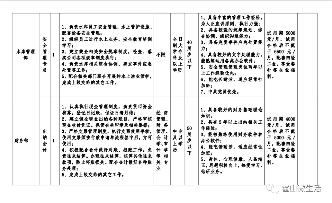综合管理部综合管理专员1名、水库管理部部门负责人1名、水库管理部安全管理专员1名、财务部出纳会计1名。