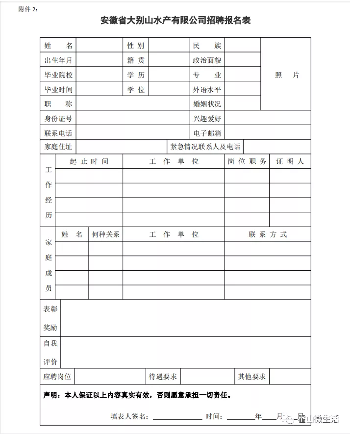 仅接受现场报名(双休日不接受报名),报名时需提交本人毕业证、学位证(全日制本科以上学历需提供)、身份证、户口本原件及复印件各一份,与报考岗位相关的职称(职业资格)证书、获奖(表彰)证书原件及复印件各一份,本人近期同底一寸证件照片3张。报名时填写《安徽省大别山水产有限公司招聘报名表》(附件2)一份,应聘者报名信息必须与本人实际情况一致,凡弄虚作假者,一经查实,取消面试、聘用资格。