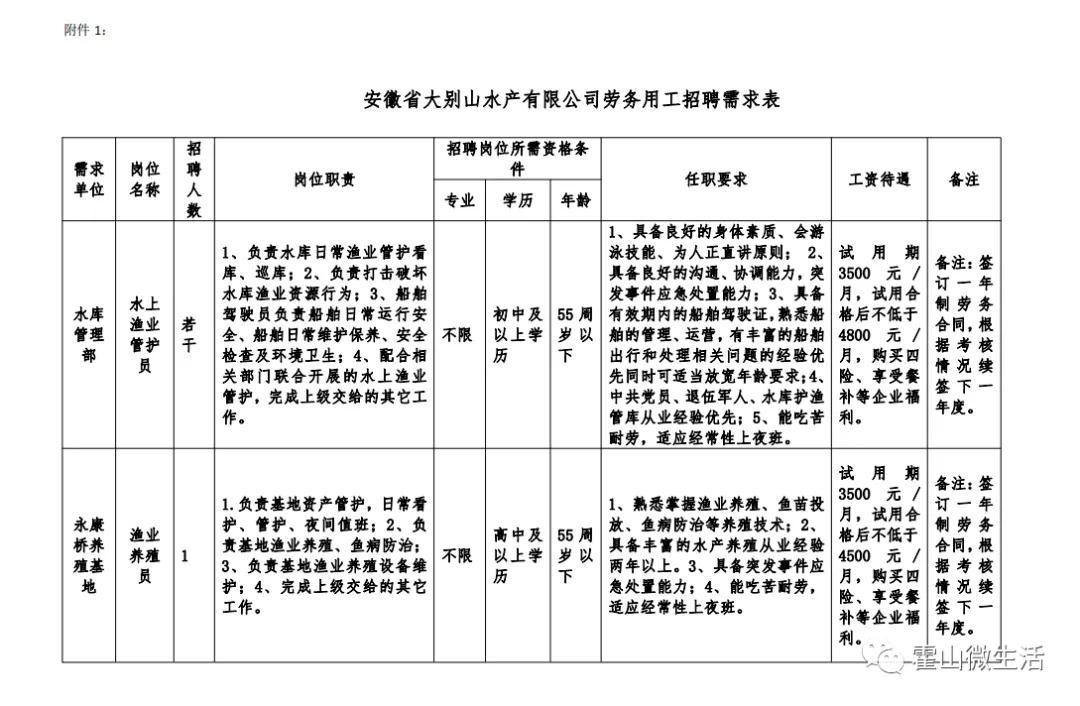 1、安徽省大别山水产有限公司劳务用工招聘需求表