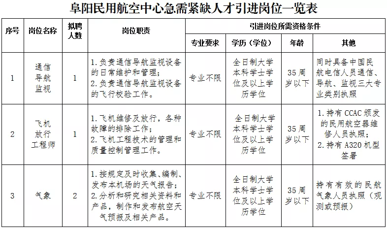 根据阜阳民航快速发展需要,阜阳民用航空中心现面向社会公开引进3个岗位4名急需紧缺人才,现公告如下: