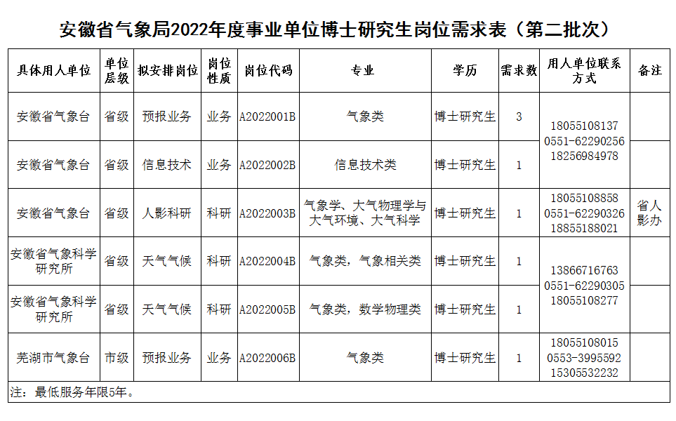 此次招聘岗位为博士岗位。具体单位、岗位、专业、学历要求等详见《安徽省气象局2022年度事业单位博士研究生岗位需求表》。