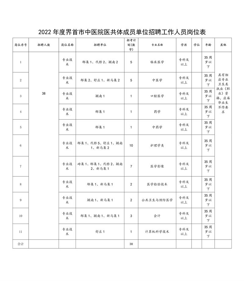 本次计划公开招聘工作人员38人,具体招聘岗位、人数、专业、报考条件等详见《2022年度界首市中医院医共体成员单位招聘工作人员岗位表》。