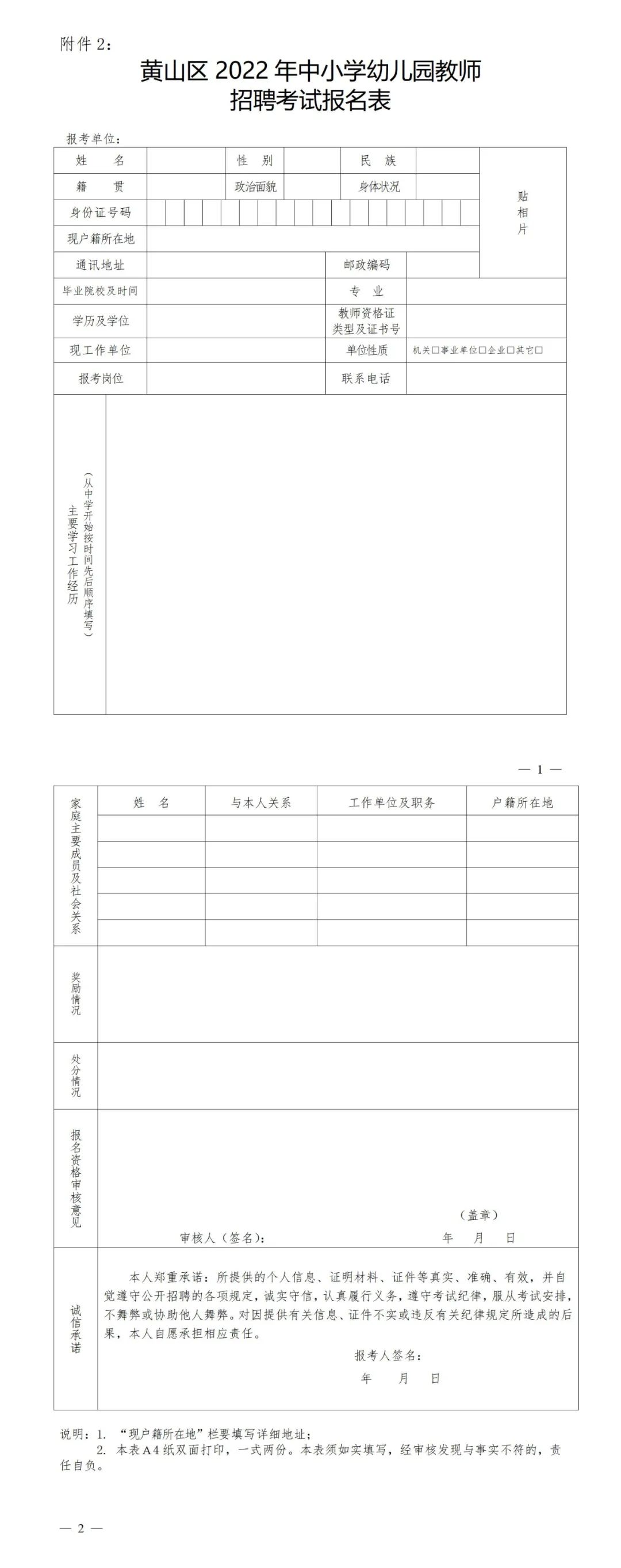 (1)提供《黄山区2022年中小学幼儿园教师招聘考试报名表》(详见附件2),一式两份,提前填写,贴好照片。