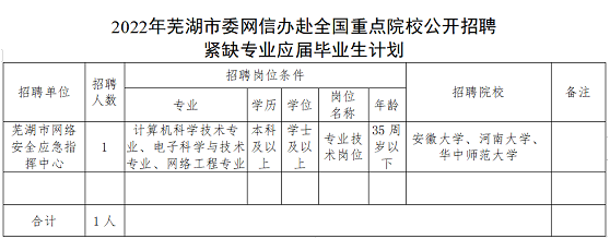 2022年芜湖市委网信办赴全国重点院校公开招聘紧缺专业应届毕业生工作方案