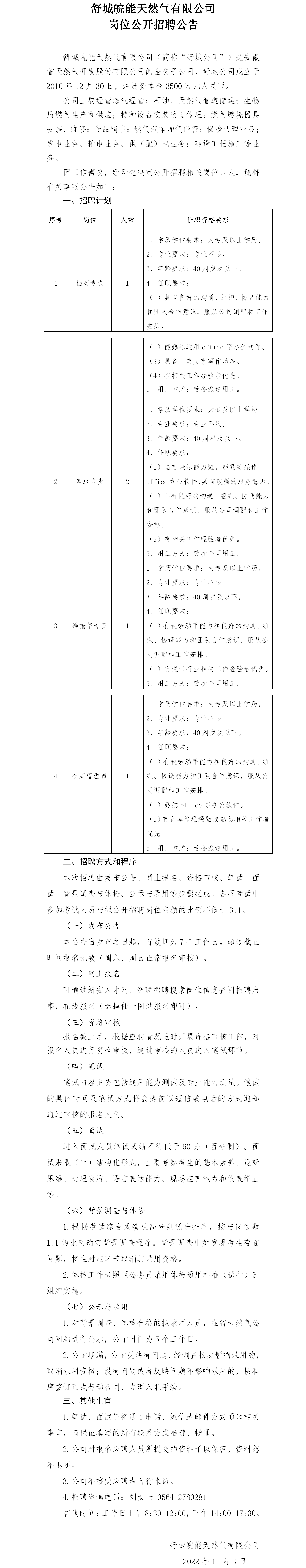 2022年六安舒城皖能天然气有限公司岗位公开招聘公告